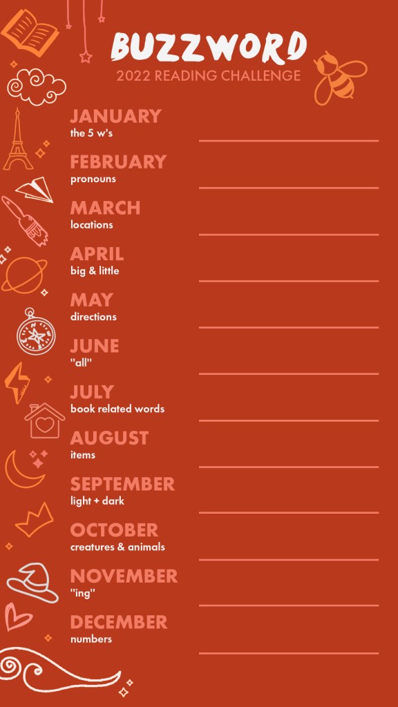 This year I’m trying to read more of what’s already on my shelves, but my friend @sarahesmaewolfe dropped @booksandlala’s 2022 Reading Challenge – The Buzzwordathon in my path instead. Check out her video explanation here.